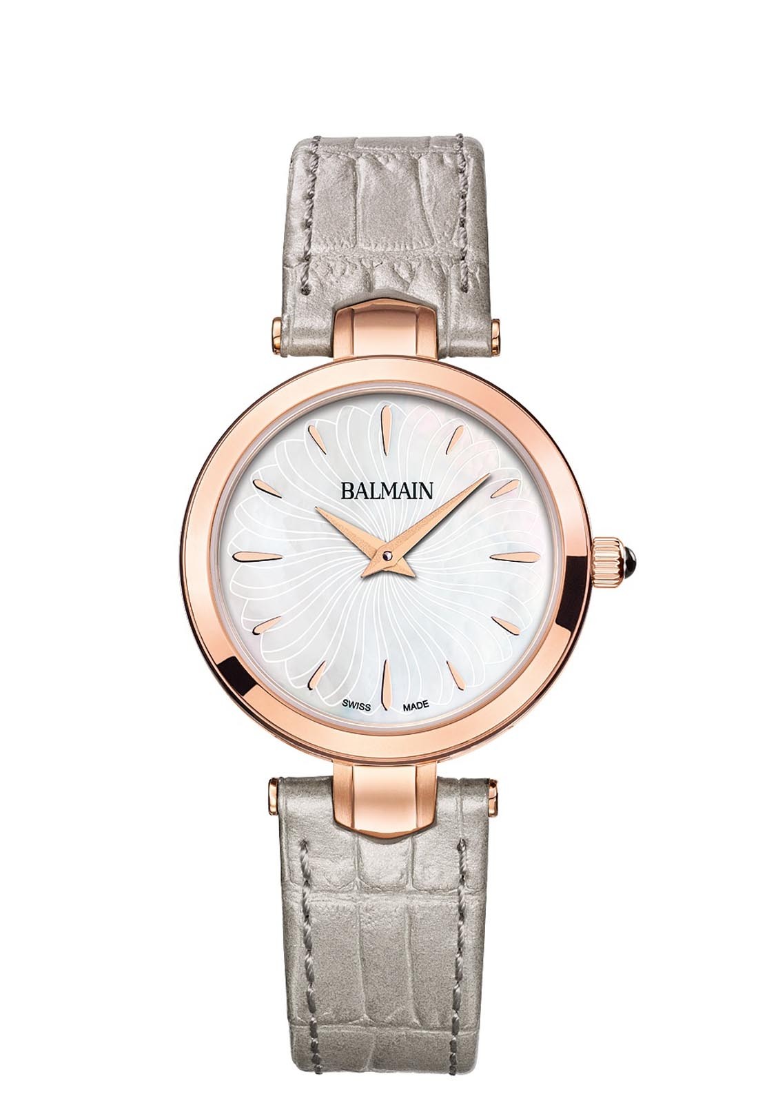 Montre Balmain quartz, collection Madrigal, boîtier acier PVD rose, cadran nacre, verre saphir, bracelet en cuir gris.