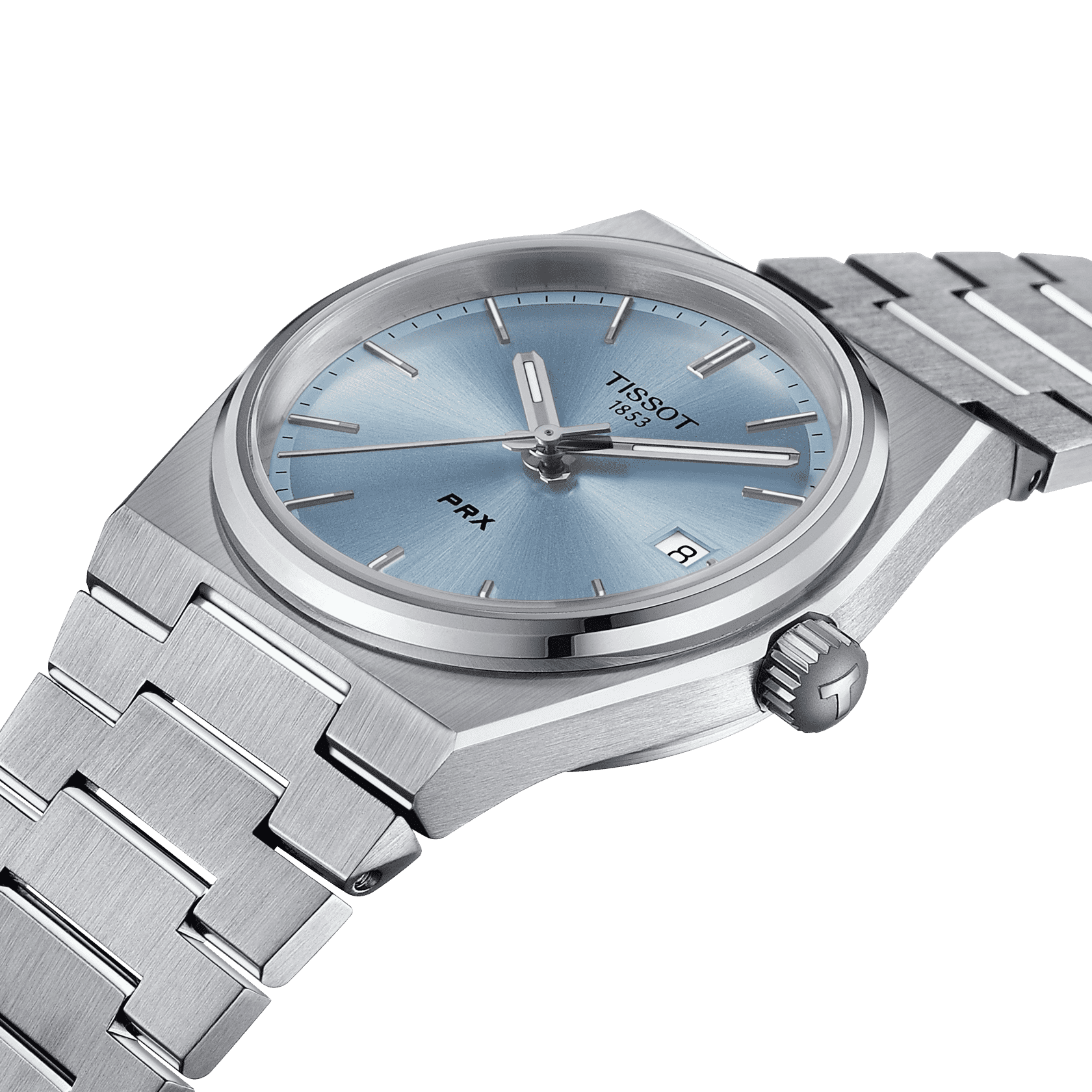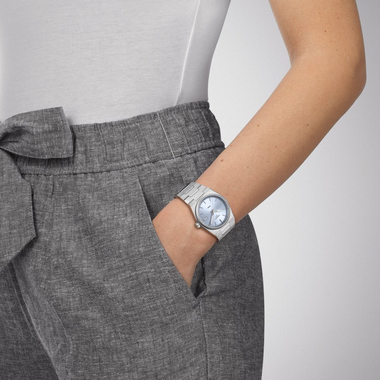 En 1978, Tissot a créé un modèle à quartz doté d’un boîtier fin, d’index fins et d’un bracelet en acier. Ses cornes larges et horizontales, typiques de l’époque, s’intègrent parfaitement dans le boîtier plat de forme tonneau. Quelques années plus tard, Tissot dépose le nom PRX. « PR » signifie « précis » et « robuste ». Le « X » représente le chiffre romain dix et la pression de 10 bars, ce qui correspond à une profondeur de 100 mètres, à laquelle la montre reste étanche. En 2021, Tissot a présenté le nouveau PRX comme une interprétation moderne du modèle précédent. Le boîtier en acier inoxydable 316L de la Tissot PRX 35 mm a un diamètre de 35 mm. Il a une forme légèrement tonneau et est orné d’une lunette étroite et ronde. Des finitions brossées verticalement et arrondies alternent avec des facettes polies sur les côtés. La Tissot PRX 35 mm est dotée d’un cadran avec des index et des aiguilles nickelés. Les lignes du boîtier se prolongent directement dans le bracelet, sans l’utilisation des cornes traditionnelles. Sa caractéristique la plus frappante est sa rangée de grands maillons qui occupent toute la largeur. Sa souplesse en fait une véritable réussite en matière d’ergonomie et procure un confort exceptionnel. La finition satinée à l’extérieur est tout aussi soignée que le polissage des surfaces intérieures. Les aiguilles de la Tissot PRX 35 mm ont un revêtement SuperLumiNova® et sont superposées avec très peu d’espacement. Cela permet de rapprocher le cadran du verre de la montre. L’effet optique obtenu par les designers de Tissot rend le boîtier de la montre encore plus plat et plus fin qu’il ne l’est en réalité. La montre est dotée d’un verre saphir résistant aux rayures et d’un mouvement à quartz Swiss Made précis et fiable. Cette version de la Tissot PRX 35 mm est dotée d’un cadran bleu clair avec index et d’un bracelet en acier inoxydable 316L avec fermoir papillon avec poussoirs.