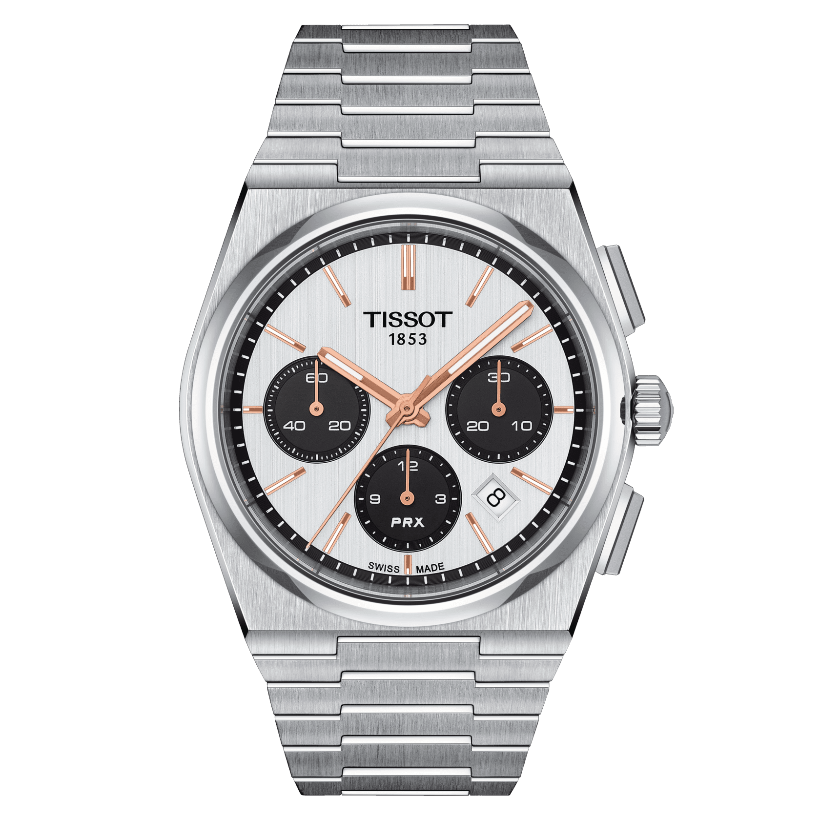La Tissot PRX Automatic Chronograph est dotée d’un cadran avec totalisateurs associés à des index et des aiguilles nickelés. Les lignes du boîtier se prolongent directement dans le bracelet, sans l’utilisation des cornes traditionnelles. La caractéristique la plus frappante de ce dernier est sa série de grands maillons qui occupent toute la largeur. Sa flexibilité et sa souplesse en font une véritable réussite en matière de design ergonomique et procurent un confort exceptionnel. Le satinage des faces extérieures est tout aussi soigné que le polissage des faces intérieures.