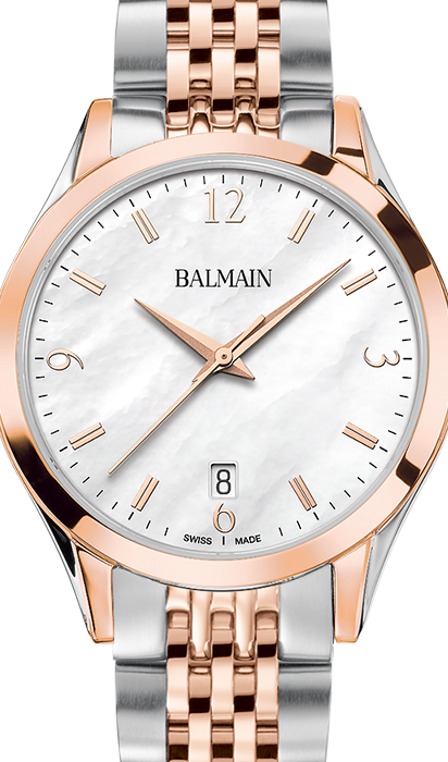 Montre Balmain quartz, collection Classic R, boîtier bicolore acier-PVD rose, cadran nacre, date, verre saphir, bracelet bicolore acier-PVD rose.