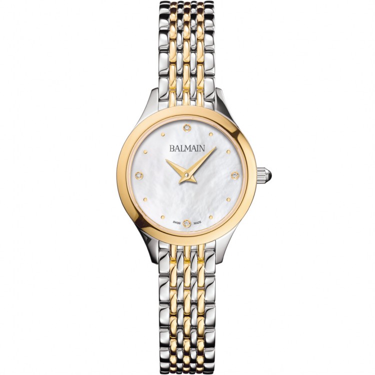 Montre Balmain quartz, collection Balmain de Balmain, boîtier bicolore acier et PVD jaune, 25 mm, cadran nacre, verre saphir, bracelet bicolore en acier et PVD jaune. Cadran serti de 4 diamants Top Wesselton VS-SI, pour un total de 0.015 carats