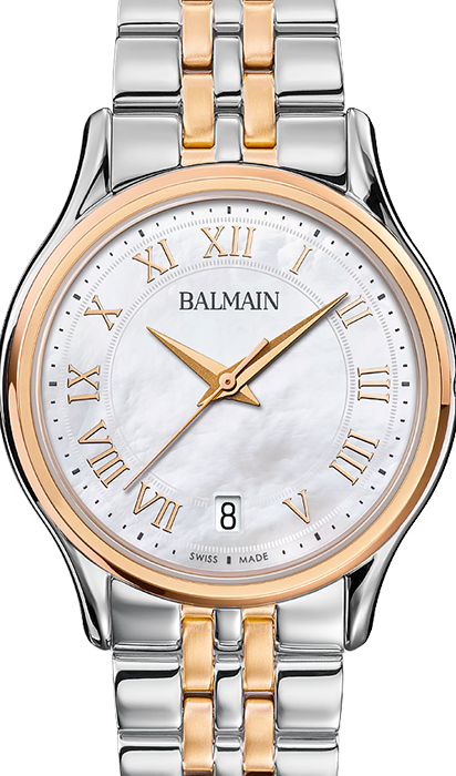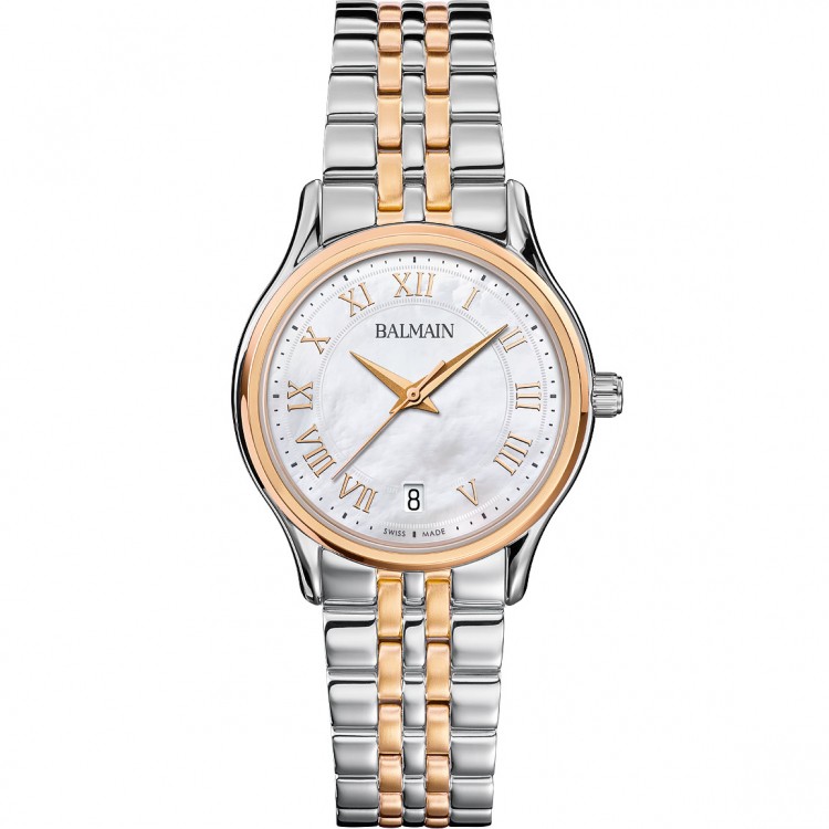 Montre Balmain quartz, collection Beleganza, boîtier bicolore acier et PVD rose, cadran nacre avec chiffres romain, verre saphir, bracelet bicolore acier et PVD rose.