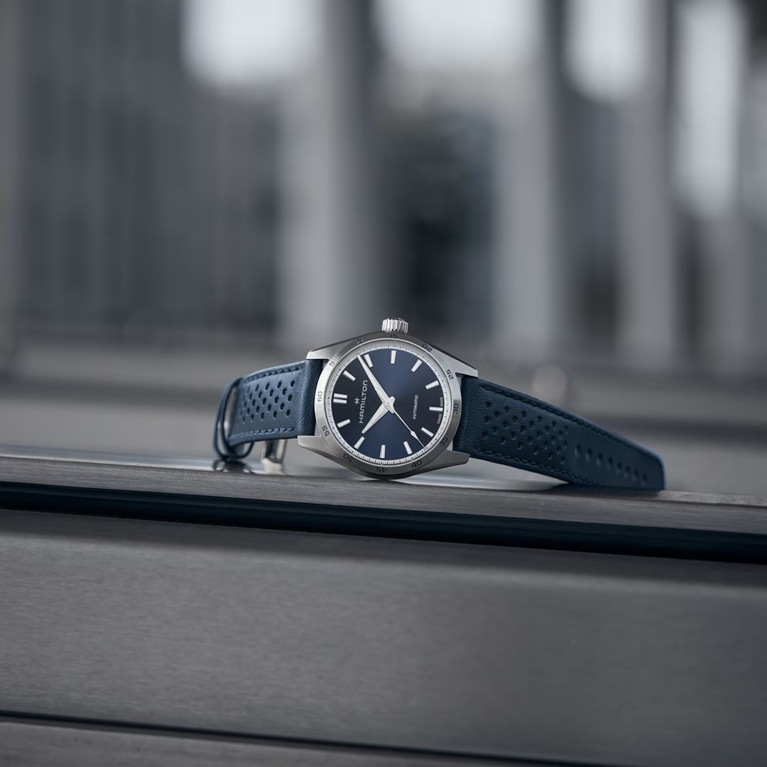 Conçues pour les amateurs de fonctionnalité et de style, les montres Jazzmaster Performer offrent une allure sport chic affirmée. Animée par le mouvement automatique H-10 avec une réserve de marche de 80 heures, cette Jazzmaster Performer Automatic présente un boîtier de 38 mm en acier inoxydable rehaussé d’un cadran bleu minimaliste et d’un bracelet en cuir bleu perforé style sport assorti.