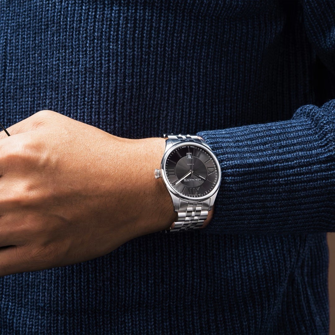 Montre classique à mouvement SWISS MADE Automatique Sellita SW200-1, 26 rubis, heures, minutes, secondes et date à 6h. Boîtier en acier inoxydable, diamètre 40,00 mm. Verre saphir bombé anti-reflets. Cadran anthracite, chiffres romains et indexes. Fond visible. Bracelet en acier. Étanchéité jusqu’à 50 mètres.