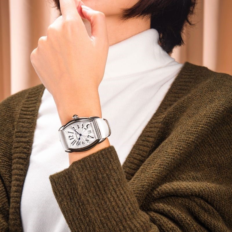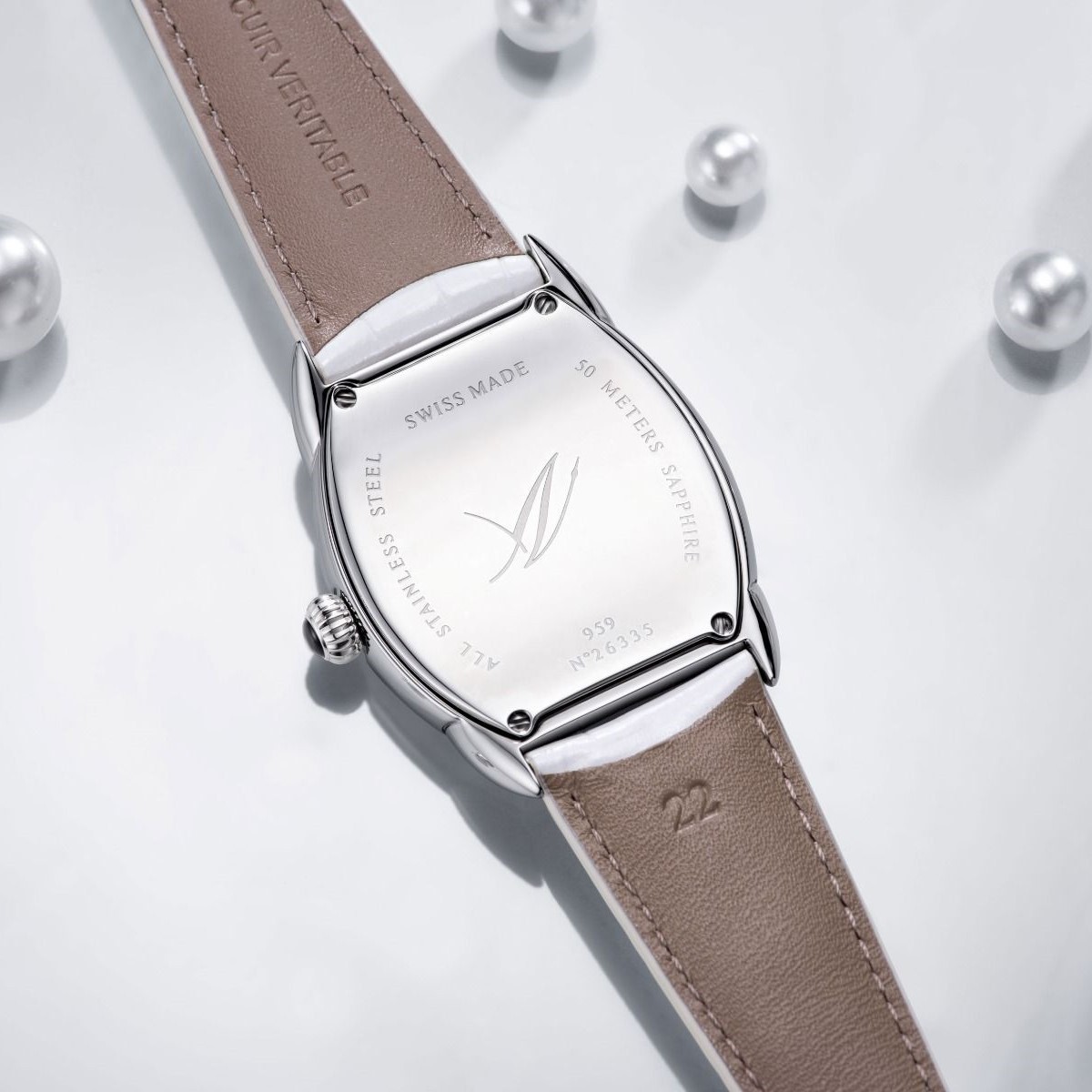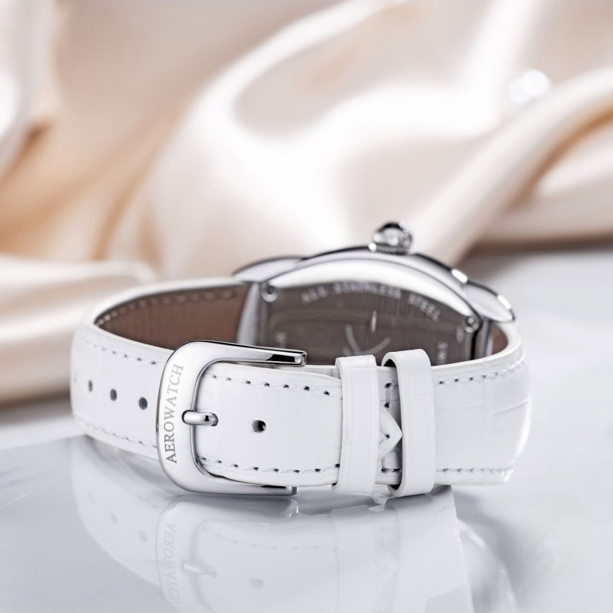 Boîtier en acier, verre saphir bombé. Cadran argenté guilloché, chiffres arabes noirs. Mouvement quartz suisse. Heures, minutes, seconde et date à 6h. Bracelet en cuir blanc 22.00 mm, boucle ardillon.