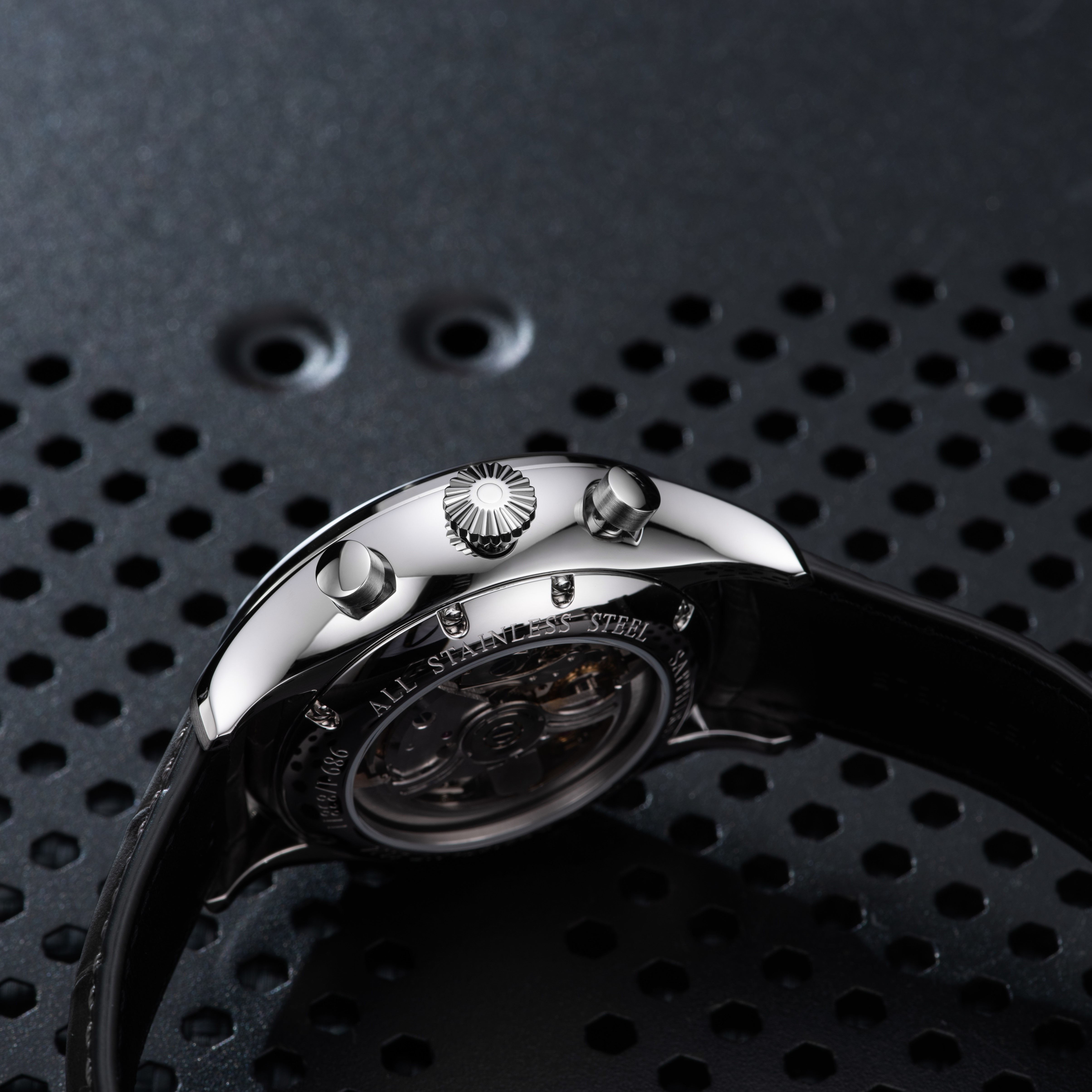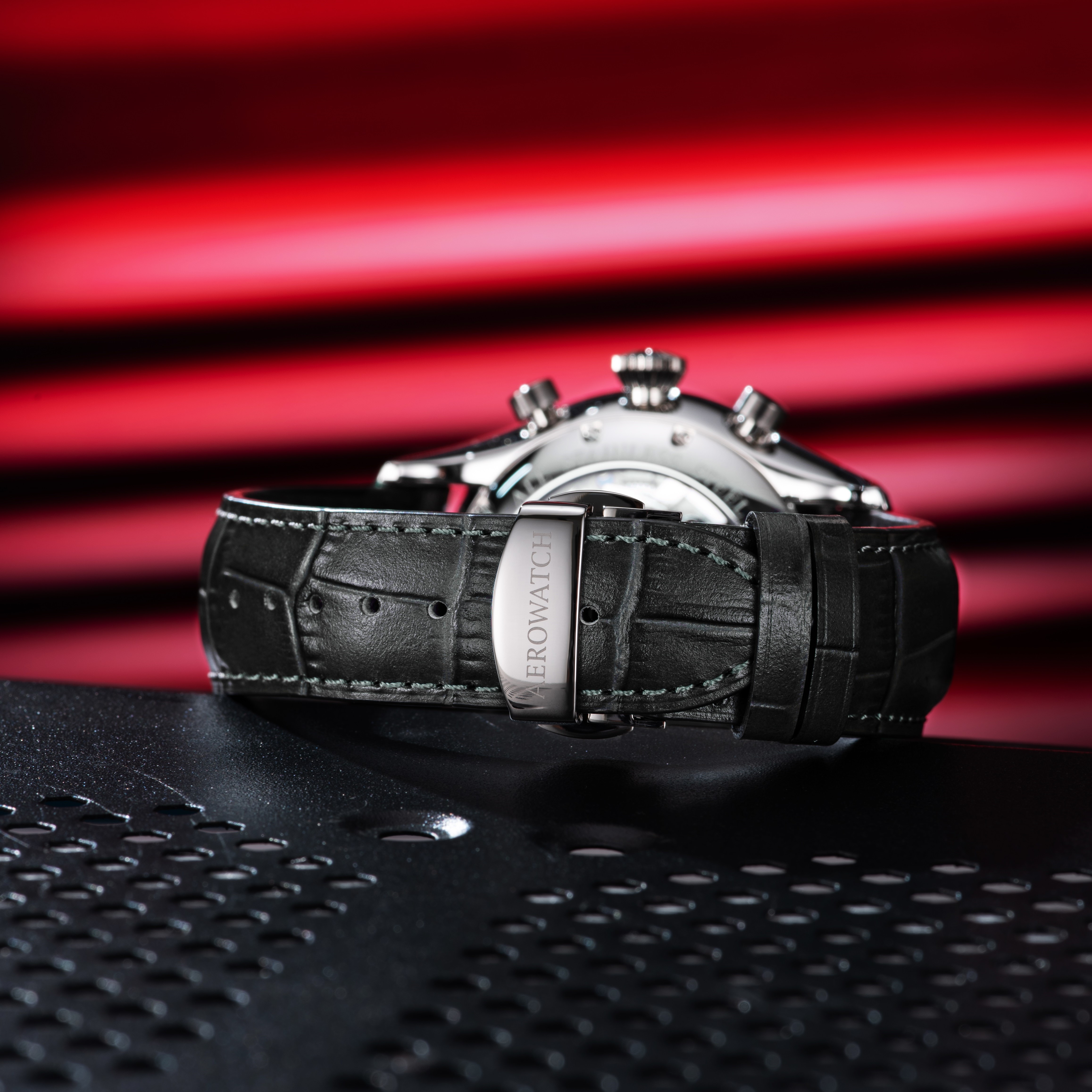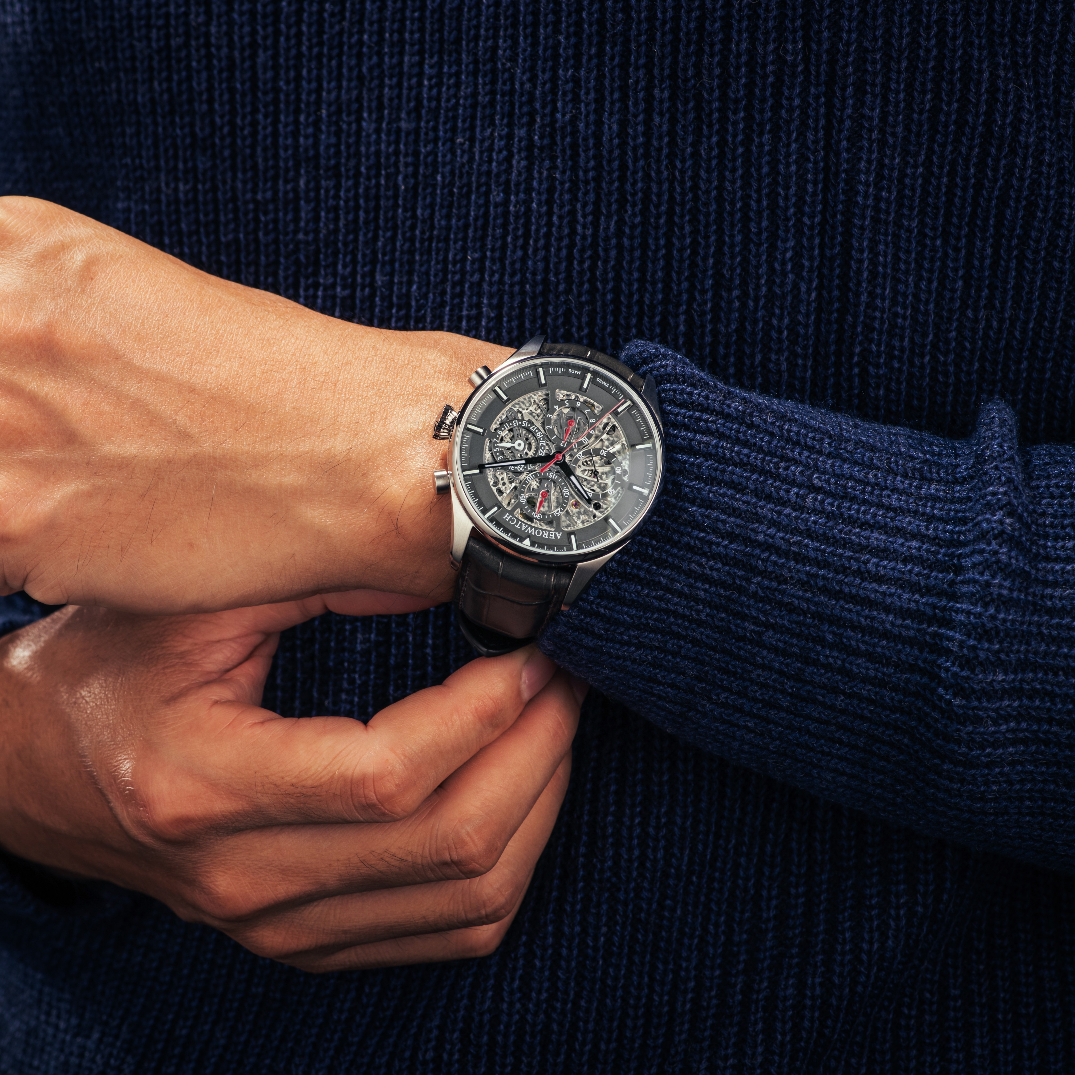 L’entreprise horlogère familiale Aerowatch mise une fois de plus sur ce qui a fait ses preuves et lance un défi aux connaisseurs de montres puisque les frères Bolzli présentent le célèbre chronographe semi-squelette automatique de la ligne « Les Grandes Classiques ». À l’affichage traditionnel, dans lequel les aiguilles partent du centre du cadran, s’additionnent les compteurs séparés des heures, des minutes, des secondes et de la date. Mais grâce à la répartition équilibrée du cadran, la mécanique s’allie et se fond dans le design de la montre. Pour un chronographe automatique semi-squelette, une division stricte du cadran est indispensable pour une indication précise de l’heure. Pour atténuer quelque peu cette sévérité, ce chronographe automatique semi-squelette se présente dans un boîtier en acier inoxydable poli satiné avec une couronne pilote et un cadran discret de couleur anthracite, auquel des aiguilles rouges apportent la touche de couleur qui convient. Les index et les aiguilles sont enduits de Luminova, ce qui permet une lecture aisée de l’heure même dans l’obscurité. Avec un diamètre de 44 mm, ce chronoscope intégré s’adapte à tous les poignets. Le cadran squeletté accroche le regard à travers le verre saphir antireflet et la montre nouvellement habillée laisse entrevoir son cœur décoré. Il est fascinant de pénétrer dans le monde mystérieux de la haute horlogerie. En observant le jeu des rouages rhodiés, le regard s’égare inévitablement vers les vis bleuies et les ponts décorés, et il ne faut rien rater du spectacle. Ce qui reste, c’est la fascination d’une belle réalisation et un grand respect pour l’art horloger. Le chronographe automatique semi-squelette « Les Grandes Classiques » prouve qu’AEROWATCH perfectionne infatigablement ses produits, à la recherche des limites du possible, tout en restant fidèle à ses valeurs.