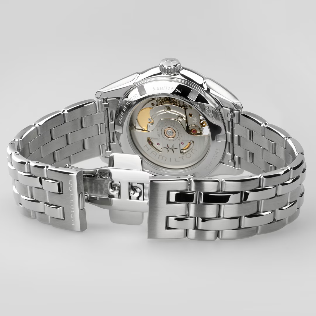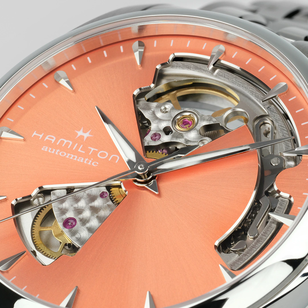 Précision est le maître mot de la Jazzmaster Open Heart 36 mm, qui révèle la subtile beauté de son mécanisme interne à travers son cadran soleillé abricot ajouré . Animée par un mouvement automatique H-10-S doté d’une réserve de marche de 80 heures et d’un spiral en Nivachron™, la Jazzmaster Open Heart est équipée d’un bracelet sophistiqué en acier inoxydable qui reflète le soin du détail et l’évolution constante du savoir-faire d’Hamilton.