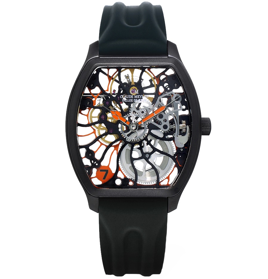 Boîtier en acier inoxydable avec revêtement PVD noir, 40 mm sur l’axe 3/9, remontage manuel, squelette, entretoise et aiguilles de couleurs, verre saphir sur le haut, fond en cristal, bracelet en cuir, mouvement noir, grille intérieure du mouvement colorée représentant symboliquement le chiffre 7 pour l’heure et le nombre de couleurs dans un arc-en-ciel