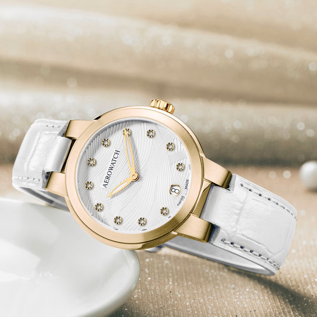 La collection Harmonie d’Aerowatch allie avec finesse design moderne et savoir-faire horloger suisse. Avec son boîtier de 35 mm aux lignes épurées et douces, cette montre est élégamment proportionnée pour le poignet de la femme contemporaine. Le cadran, orné d’un décor délicatement ondulé, apporte une texture vivante et subtile qui capte la lumière avec raffinement.
