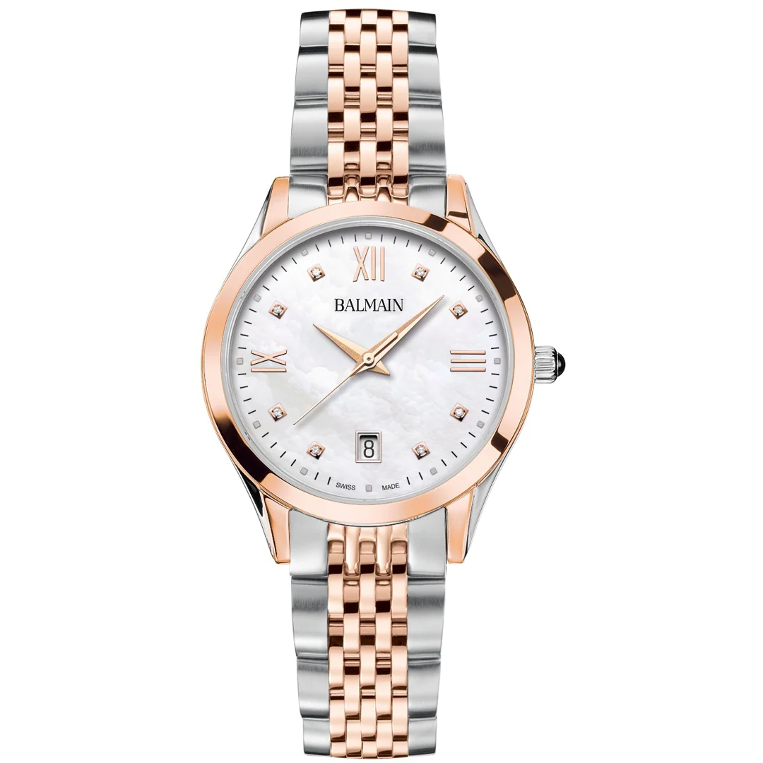 La Balmain Classic R est une montre féminine gracieuse alliant élégance audacieuse et design moderne inspiré de la Haute Couture parisienne. Son cadran en nacre blanche, serti de 8 diamants Top Wesselton VS-SI totalisant 0,030 carat, et ses chiffres romains classiques lui confèrent une touche vibrante et raffinée. Son boîtier bicolore de 34 mm en acier inoxydable et PVD or rose, doté d’un profil élégant de 6,80 mm et d’un bracelet assorti, offre un style élégant au quotidien. Ce garde-temps de fabrication suisse est doté d’un verre saphir.