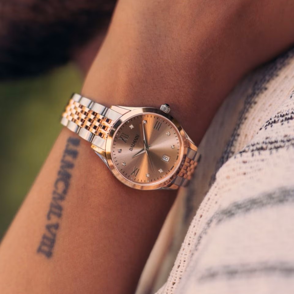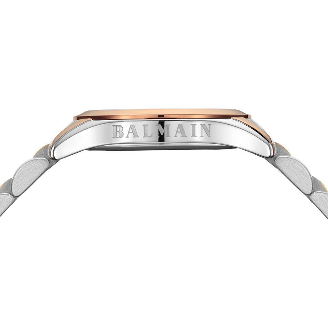 La Balmain Classic R est une élégante montre pour femme alliant sophistication éclatante et design moderne inspiré de la Haute Couture parisienne. Son cadran en or rose, serti de 8 diamants Top Wesselton VS-SI totalisant 0,030 carat et de chiffres romains classiques, lui confère une touche de douceur et de raffinement. Son boîtier bicolore de 34 mm en acier inoxydable et PVD or rose, doté d’un profil élégant de 6,80 mm et d’un bracelet assorti, offre une sophistication au quotidien. Ce garde-temps de fabrication suisse est doté d’un verre saphir.
