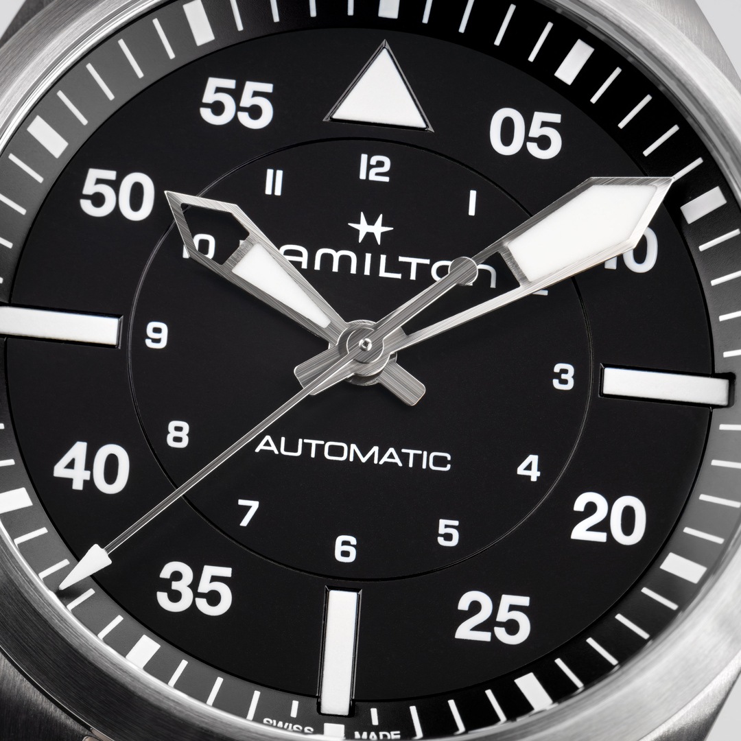 Destinée aux véritables passionnés d’aviation , la Khaki Aviation Pilot évoque l’esprit d’exploration et d’aventure de la Khaki. Alimenté par le mouvement automatique H-10 avec une réserve de marche de 80 heures et un spiral en Nivachron™. La Khaki Aviation 39 mm possède un bracelet en acier inoxydable poli et brossé ainsi qu’un cadran entièrement noir.