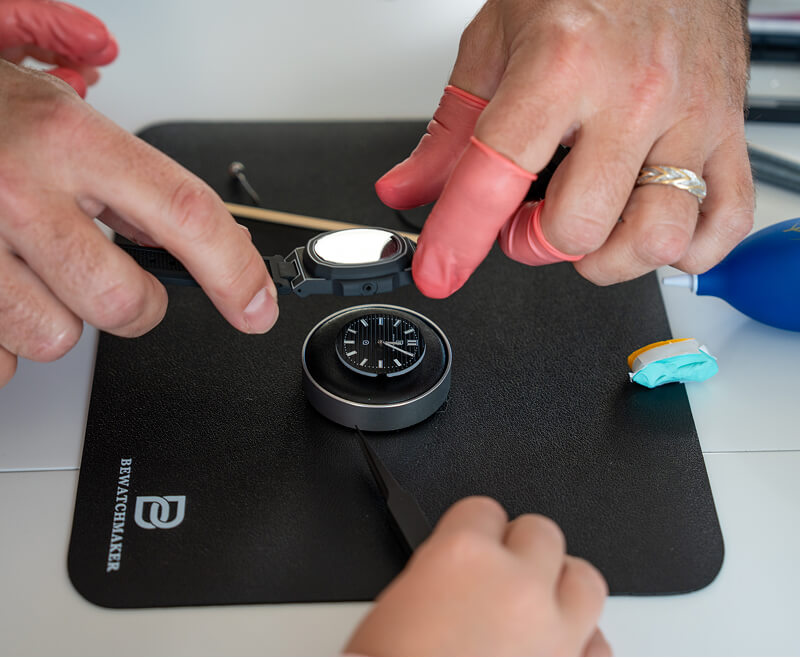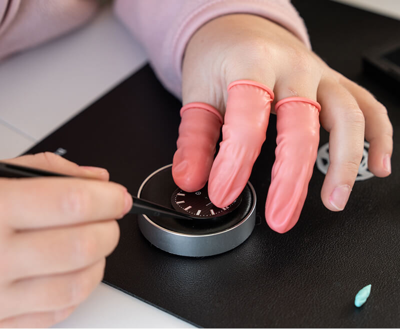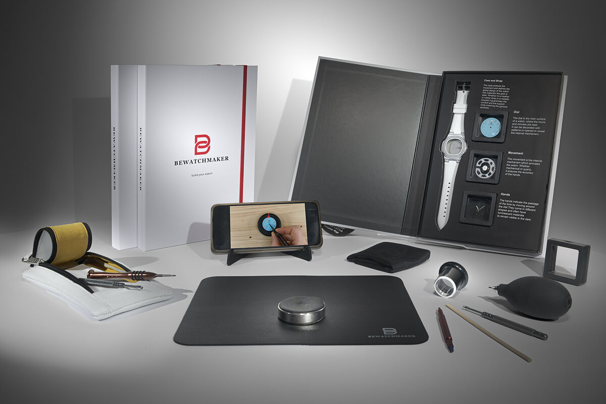 Il te suffit de suivre le tutoriel sur ton téléphone : tu apprendras à emboîter le mouvement, chasser les aiguilles, poser le cadran et assembler ta montre étape par étape.